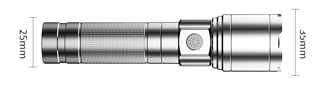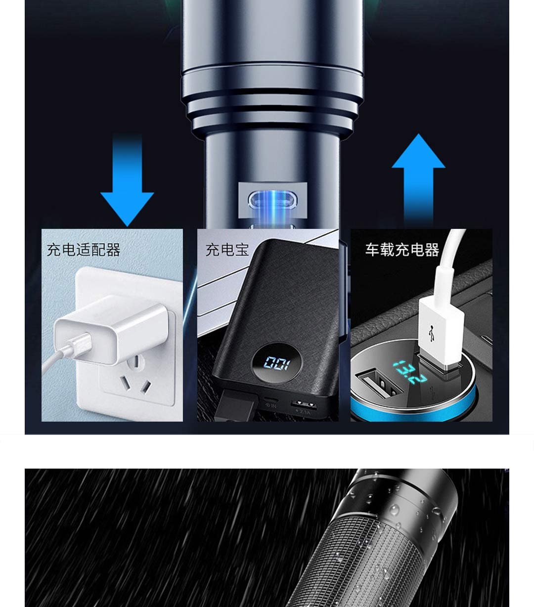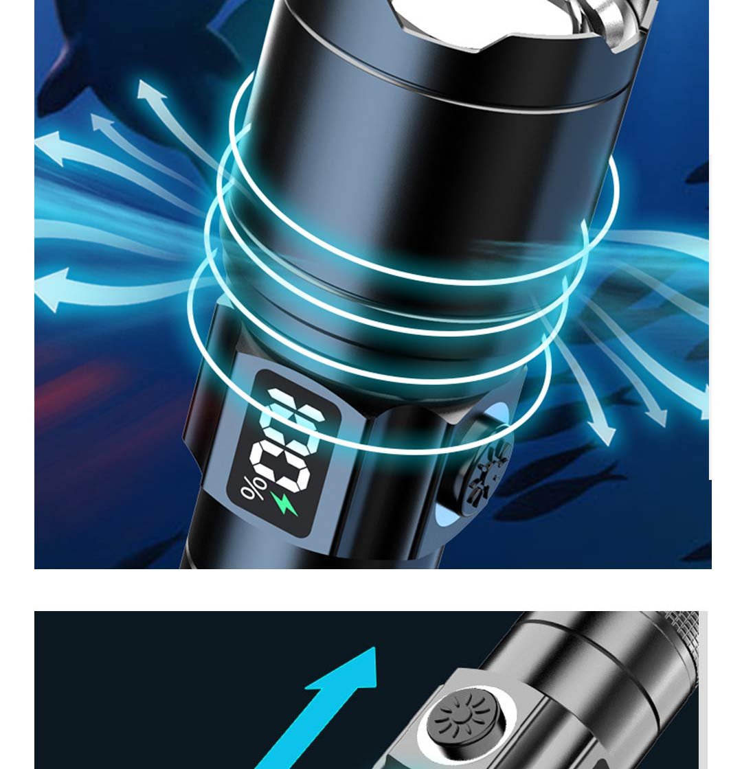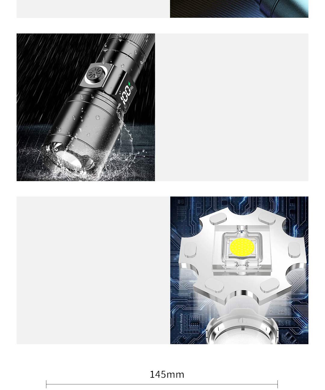 • امکانات: نمایشگر LCD ضد آب (نمایش باتری)، حالت Burst + SOS، قابل شارژ با پاوربانک، شارژر موبایل، شارژر فندکی، ضد آب