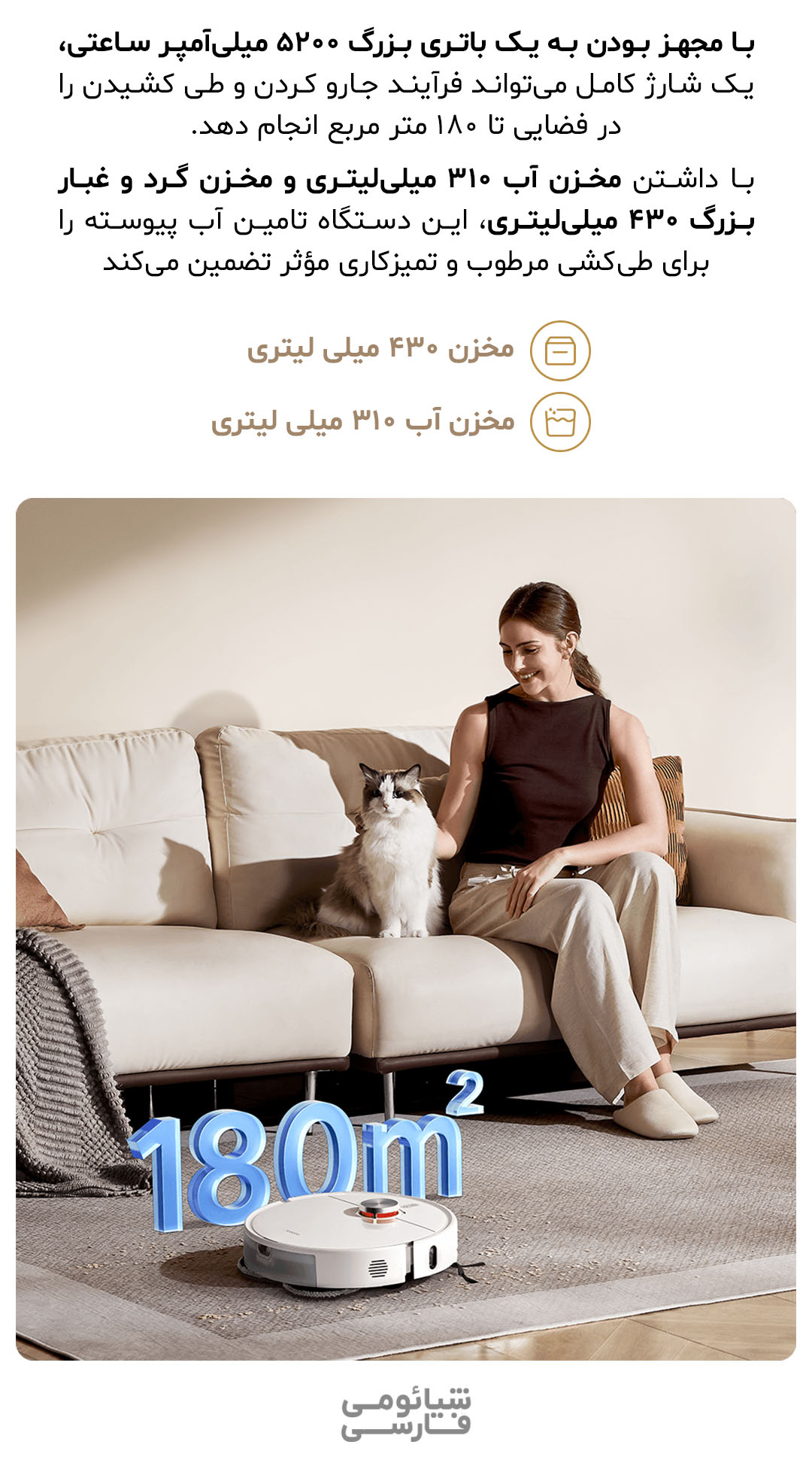 • مساحت تمیزکاری: 180 متر مربع با یک‌بار شارژ